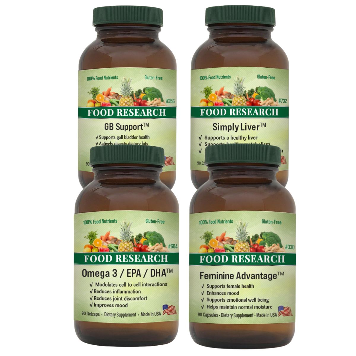Healthy hormones require a healthy liver and healthy fat that is properly assimilated which is why Simply Liver, Omega’s, and GB Support are coupled with the Feminine Advantage to support the hormones.